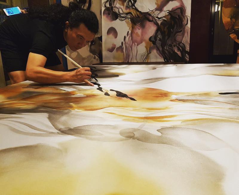 INDONESIAN ARTIST JOHN MARTONO WITH UNTITLED, 2018, PAINT ON SILK WITH HAND STITCHING, COMMISSIONED BY FIIDAA ART FOR THE CAPITOL KEMPINSKI HOTEL, SINGAPORE