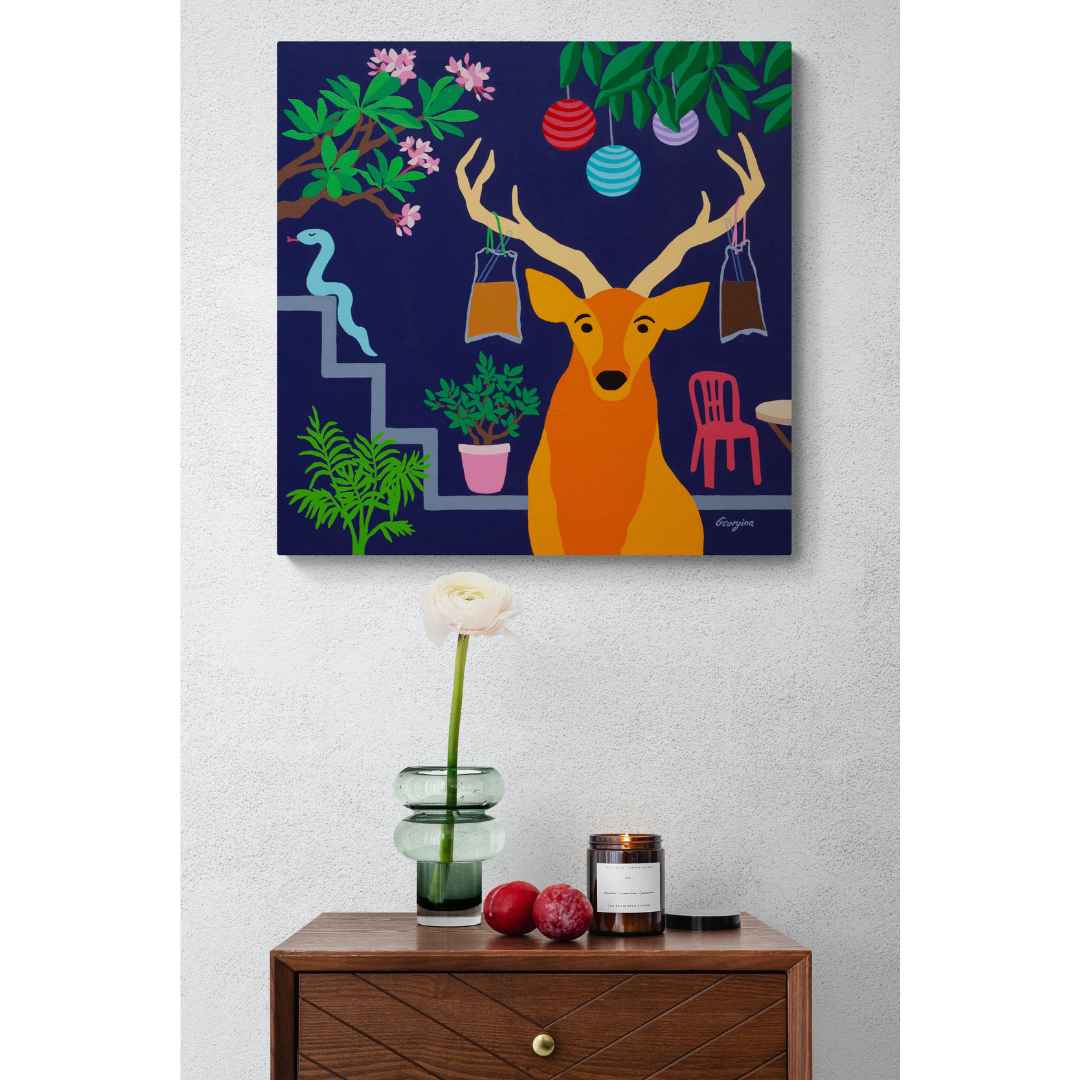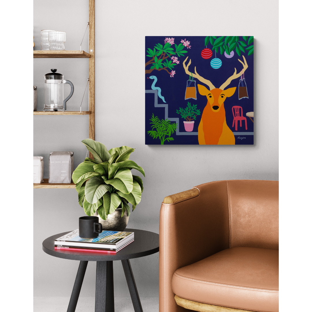 Amidst Singapore’s bustling streets and gleaming skyscrapers, green spaces and wildlife quietly thrive. A sambar deer is on a kopi run, carrying two bags of coffee from a local coffeeshop on its antlers. The painting celebrates the city’s unique mix of urban energy and natural beauty, where everyday life and the wild unexpectedly meet.