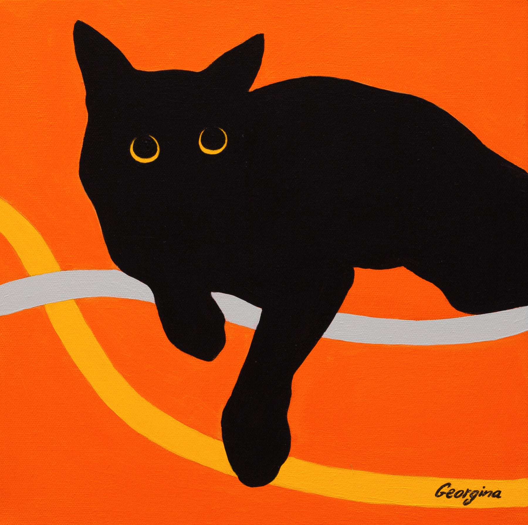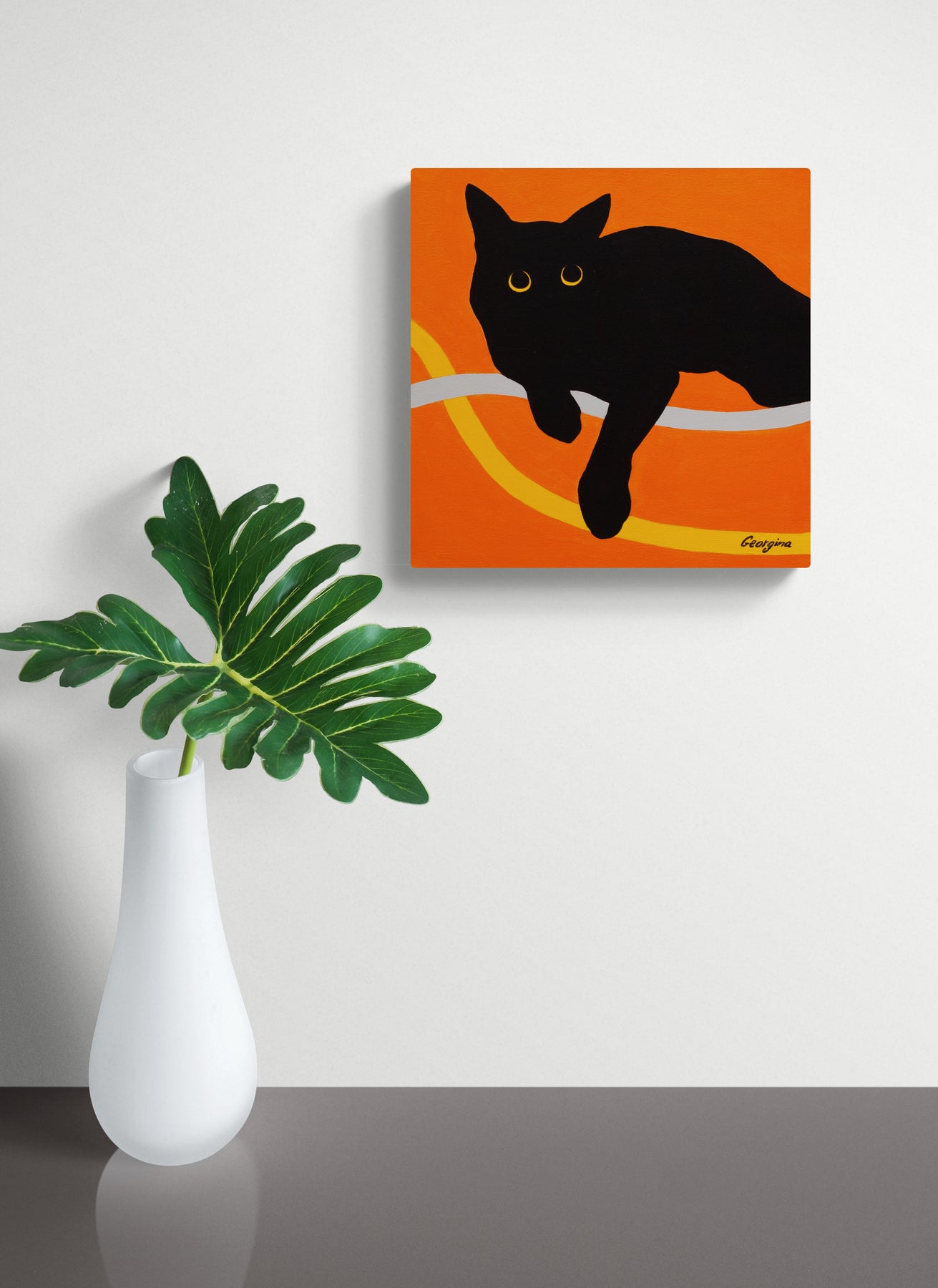 This painting can be enjoyed on its own or paired with other paintings in Georgina's black cat series. The colours of all paintings in the same series have been mindfully chosen to complement each other. This artwork has painted edges, is wired and ready-to-hang.